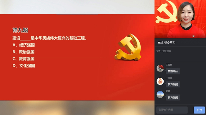 作为本次线上党建活动的创新,好未来还利用教育科技企业的技术优势,举行线上党建理论知识抢答。数百位党员在直播间内踊跃参与互动答题,在轻松愉悦的氛围中提高了自身思想理论水平。